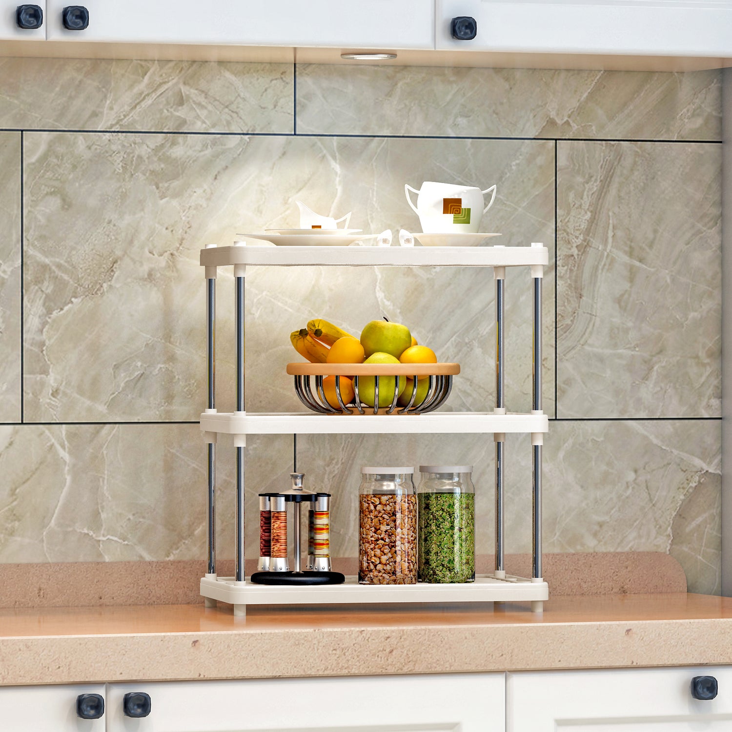 Scaffale portatutto Bianco realizzato con tubi in metallo e Ripiani in plastica grigliati .