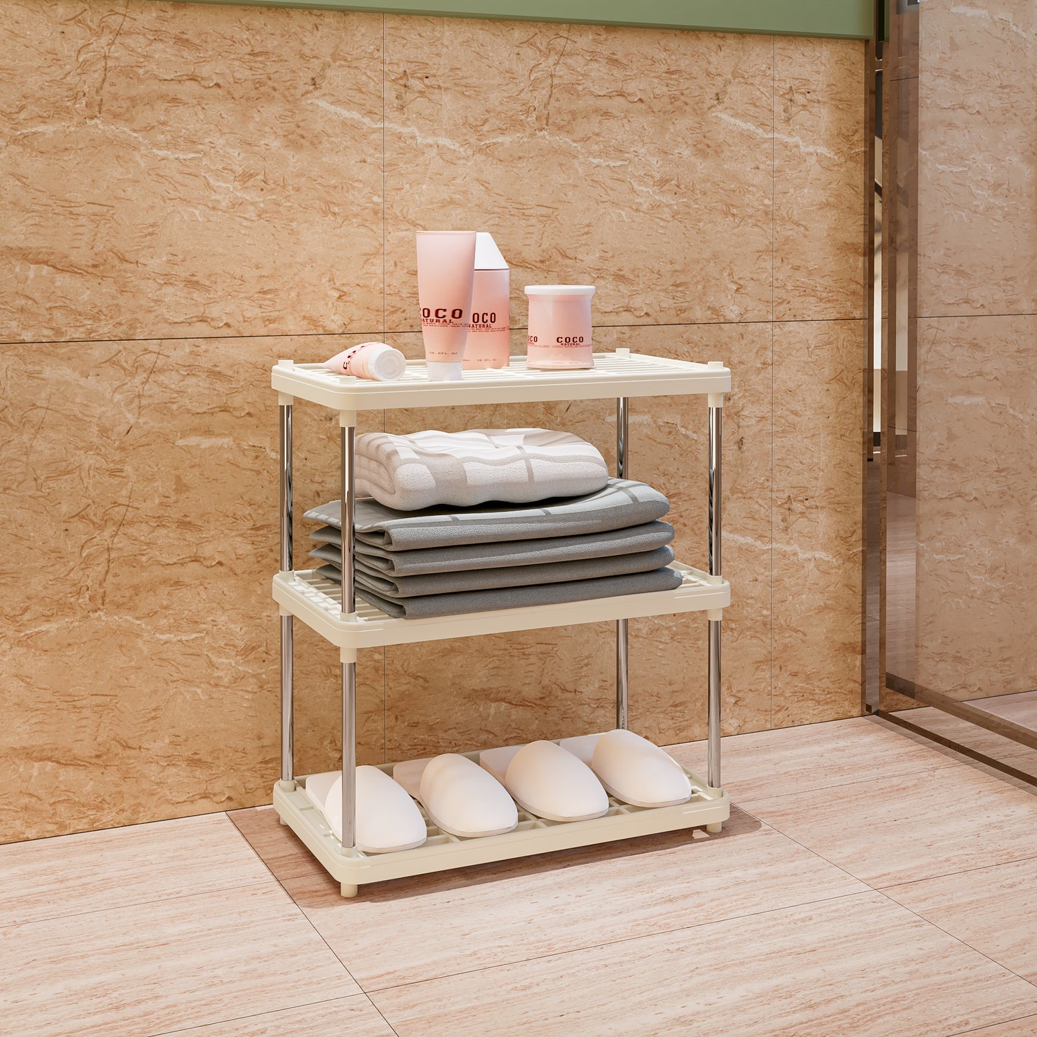 Scaffale a 3 o 4 ripiani con telaio in metallo e piani in plastica.