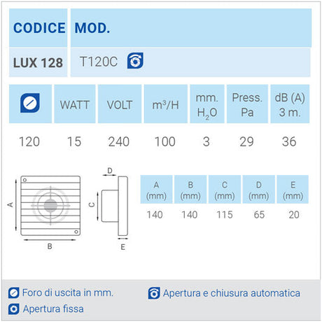 €32,50Prezzo unitario /Non disponibileLUX128 Ø120 Aspiratore da parete con apertura e chiusura automatica