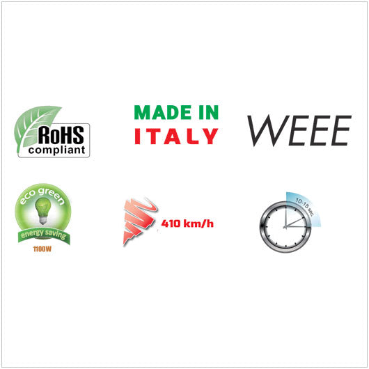 Asciugamani elettrico, superveloce e a risparmio energetico. Inserimento delle mani dall’alto (modello “a tasca”) con vaschetta di raccolta acqua alla base dell’apparecchio. Modello con resistenza elettrica regolabile on/off.