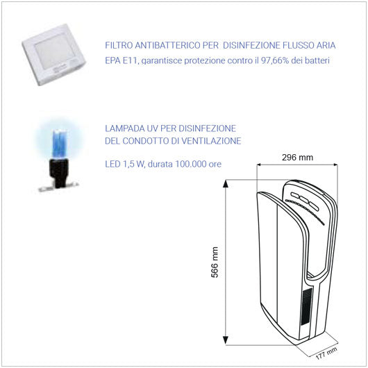 Doppio filtro antibatterico incluso. Doppia Lampada antibatterica per la sanificazione del blocco motore. LED azzurri nel punto di inserimento delle mani.