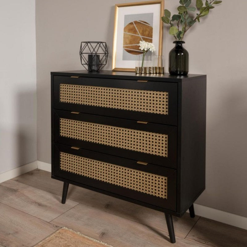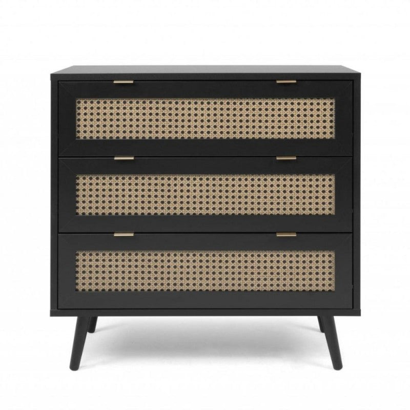 Cassettiera 3 cassetti nera con frontali vimini