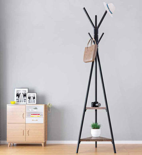 €33,90Prezzo unitario /Non disponibile Appendiabiti triangolare struttura in metallo verniciato nero, con 2 ripiani colore noce.