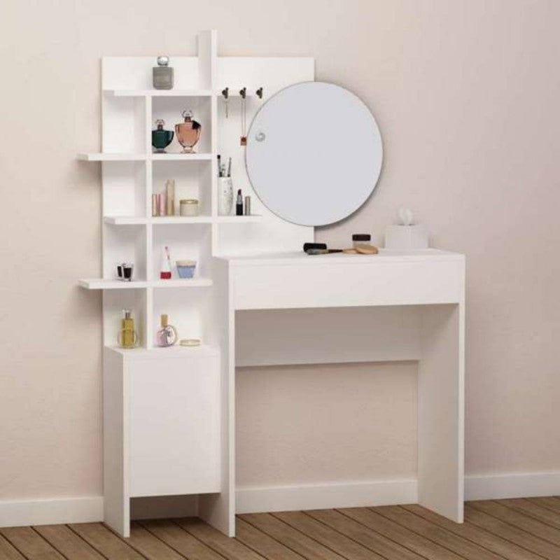 Toilette per trucco con 1 cassetto, 1 base con anta con ripiano, specchio rotondo e 1  struttura con vani a giorno.