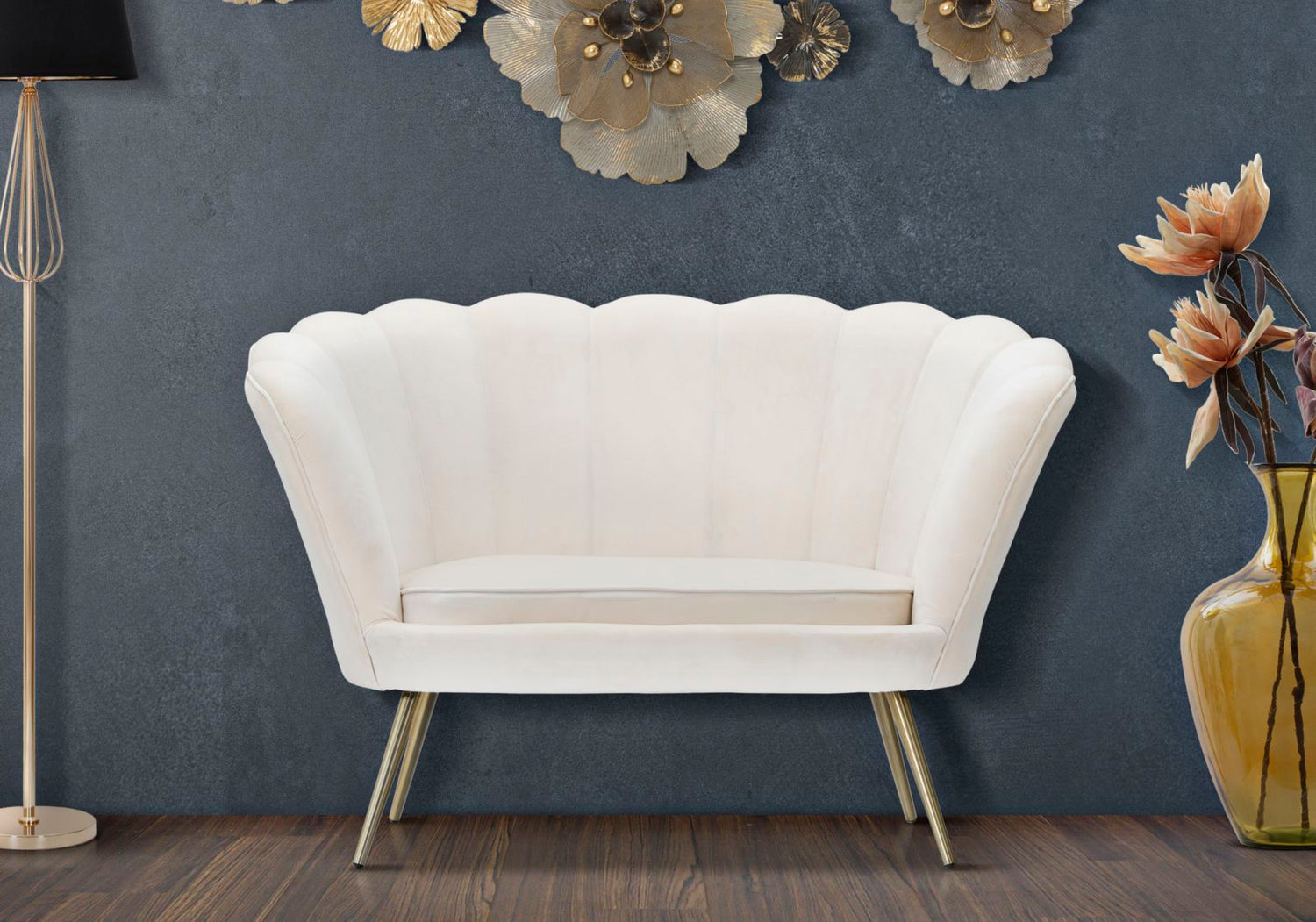 Divanetto 2 Posti in Velluto Color Crema Con Gambe Dorate Dal Particolare Design Che Richiama i Petali di un Fiore. L'eleganza Del Velluto e Del Metallo Dorato si Uniscono Per Creare Uno Stile Unico.