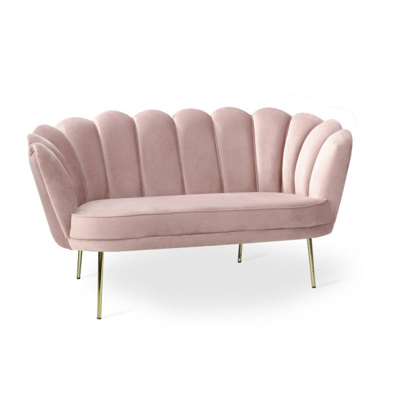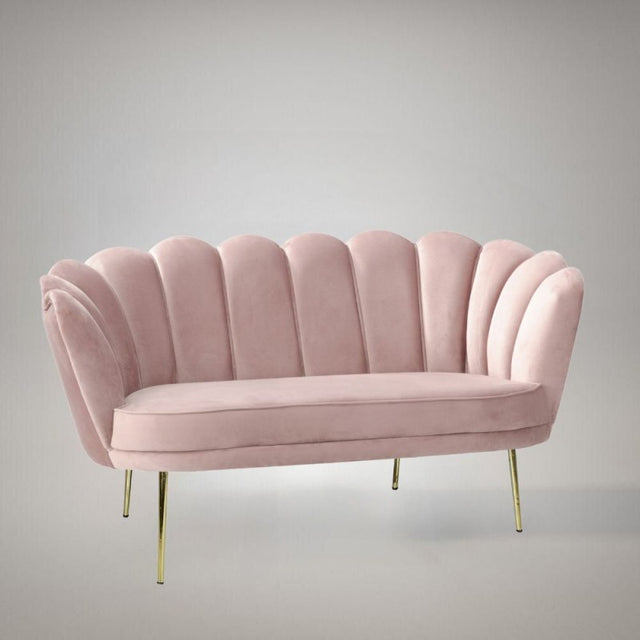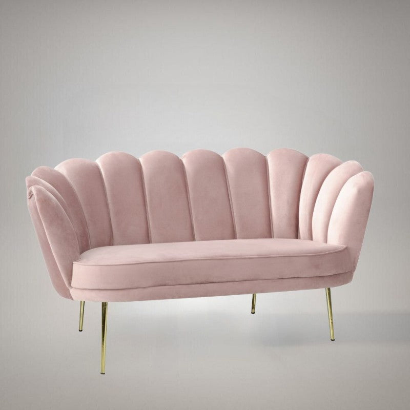 Divano in tessuto rosa 2 posti con struttura in legno forma a conchiglia .