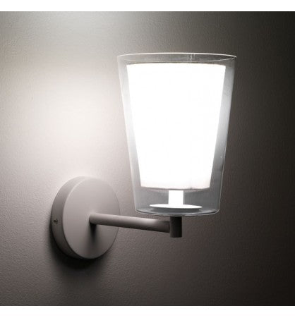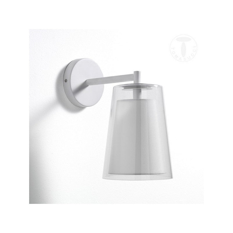Applique paralume realizzato in vetro Trasparente - paralume interno realizzato in tessuto Bianco - predisposto per nr.1 lampadina E27 max 60(non in dotazione) - struttura in metallo Bianco opaco - paralume cm. Ø.16/11 - dimensioni cm. L.16 x P.28 x H.29