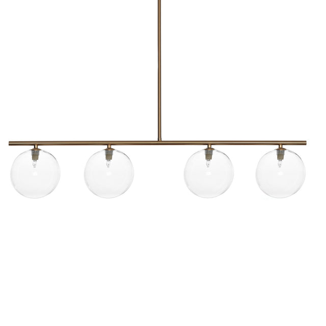 Lampadario realizzato in acciaio verniciato Ottone anticato opaco completo di 4 paralumi realizzati in vetro trasparente Ø.15,5 cm.