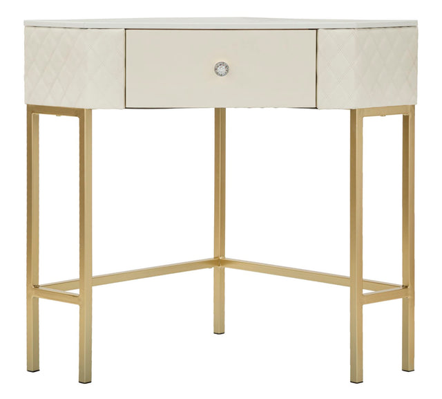 Consolle ad angolo trapuntata in simil pelle con eleganti gambe dorate e poggiapiedi integrato. Pomello a forma di brillante per un tocco di lusso e stile.