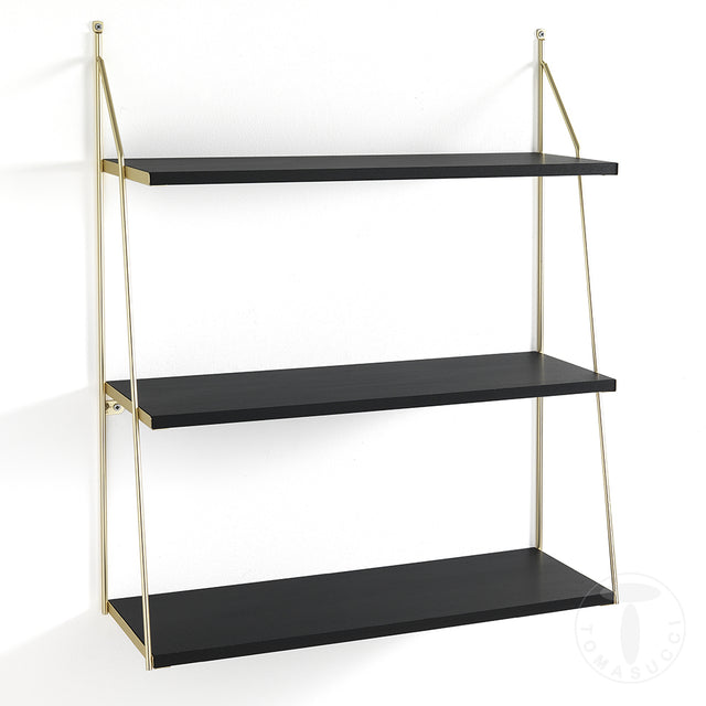 -Mensola da parete ripiani realizzati con pannelli ecologici di particelle di legno rivestito in PVC Nero opaco-Colore Nero filo in acciaio di colore Oro opaco mm. Ø.7.