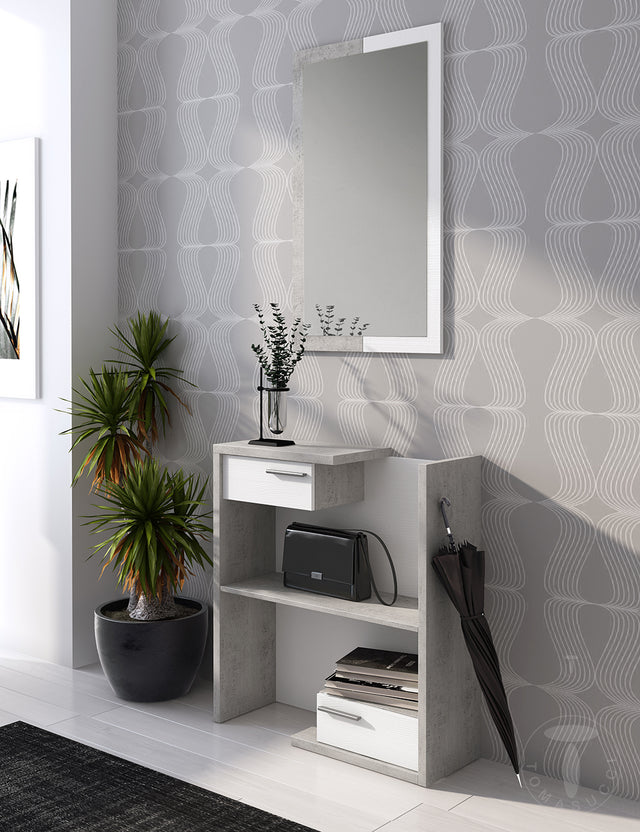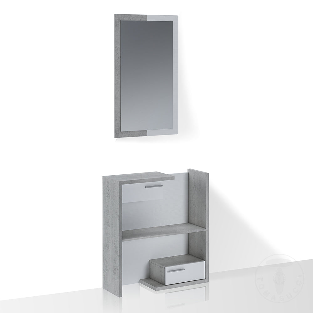 Ingresso realizzato con pannelli ecologici di particelle di legno rivestiti in melamminico finitura Cemento / Larice Bianco a - Nr.2 cassetti cm.L.37,5 H.14,5 - Nr.1 specchio cm. H.100 x L.59 - dimensioni cm. H.90 x L.83 x P.29 .