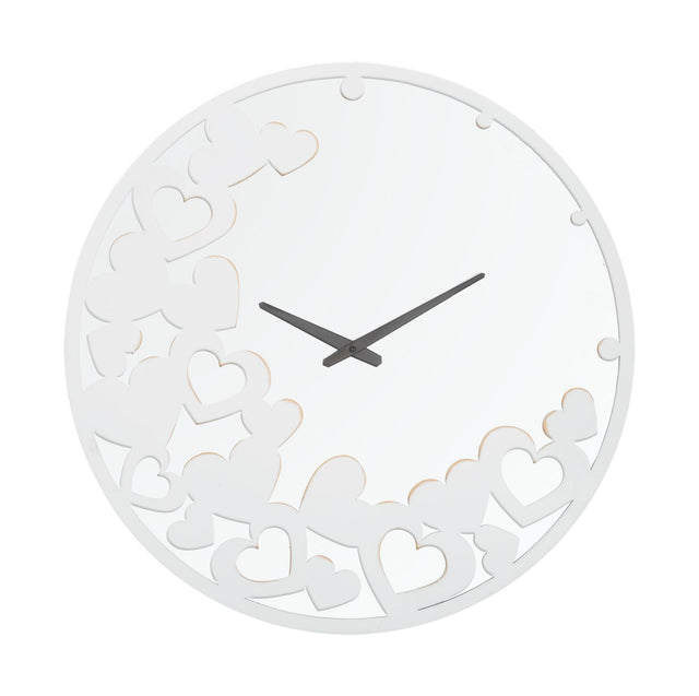 Orologio da parete in metallo bianco e specchio con eleganti cuori intagliati che dona un tocco di semplicità e classe ad ogni ambiente.