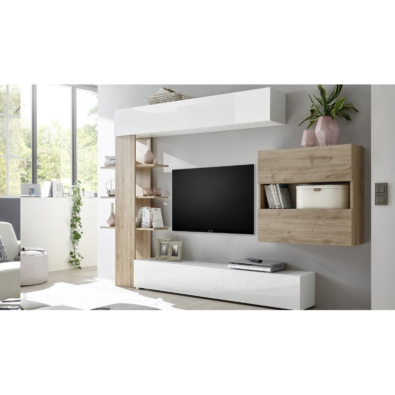 Parete attrezzata, con una ribalta,un vasistas, un pensile con vano a giorno piccolo più due ribalte e colonna con libreria, finitura Bianco e Rovere