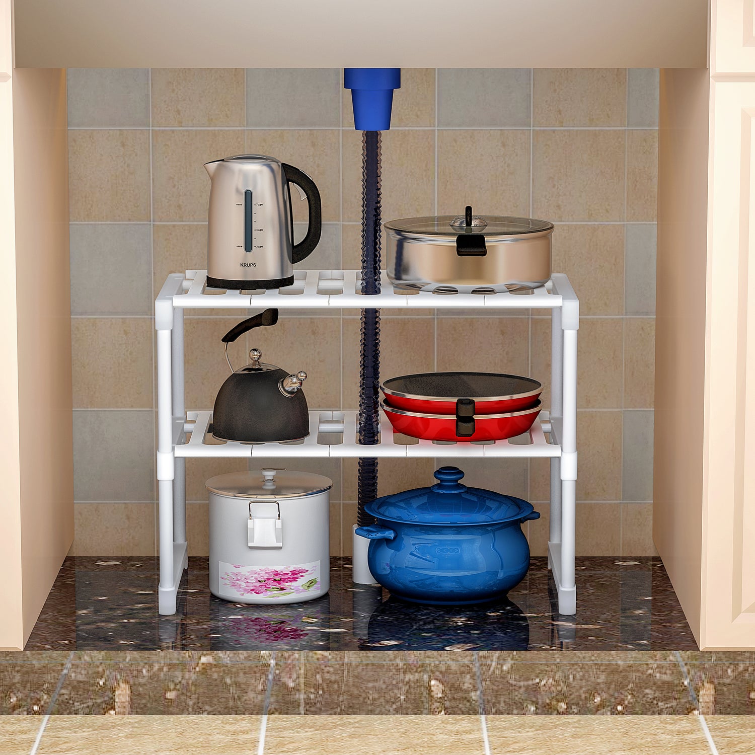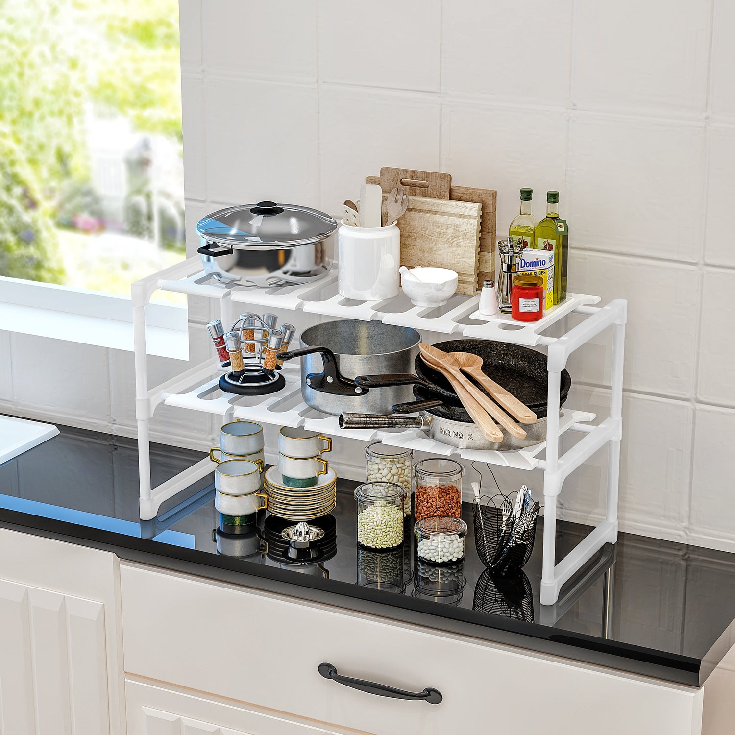 Scaffale estensibile da 52 a 86cm, realizzato con tubo in metallo verniciato 2 piani con elementi di plastica ad incastro e regolabili molto resistente 52/86x30x44cm (bianco) .