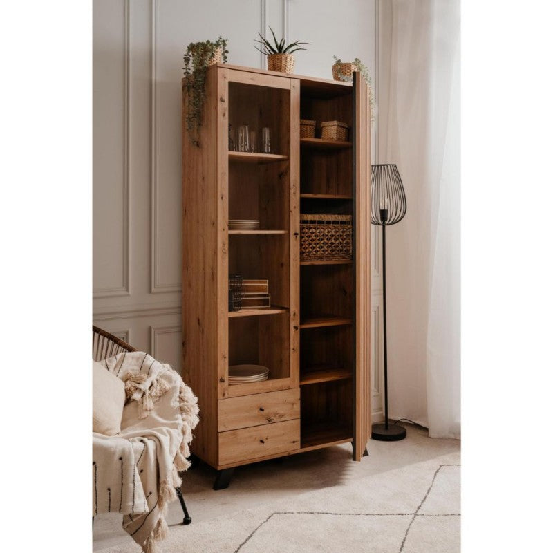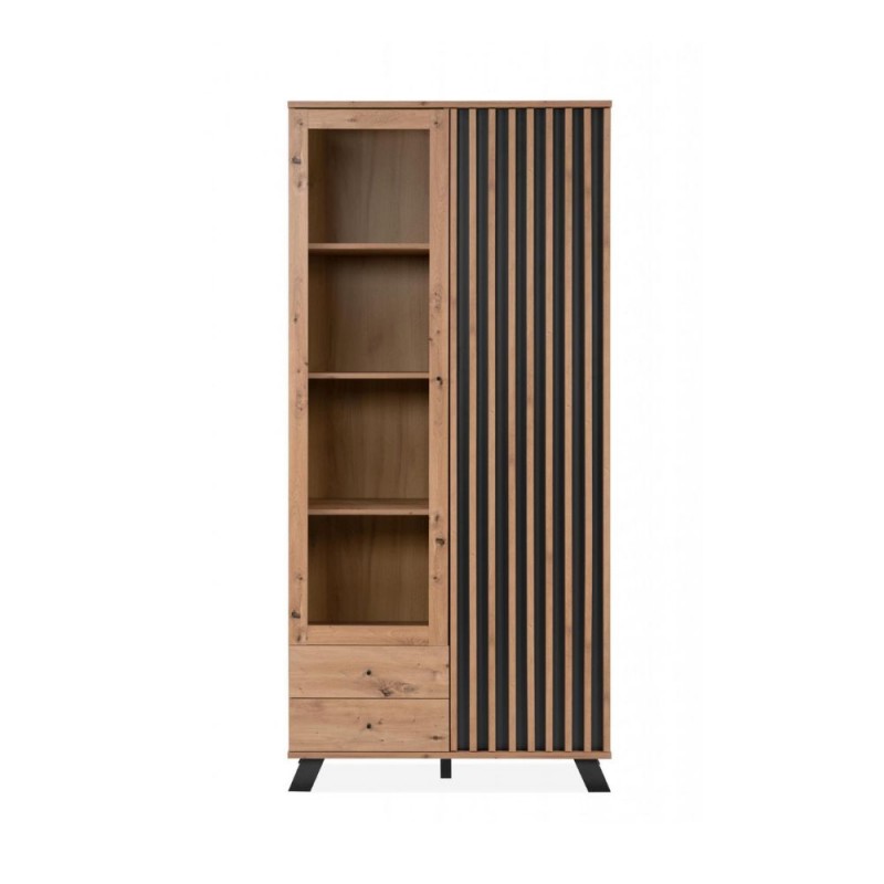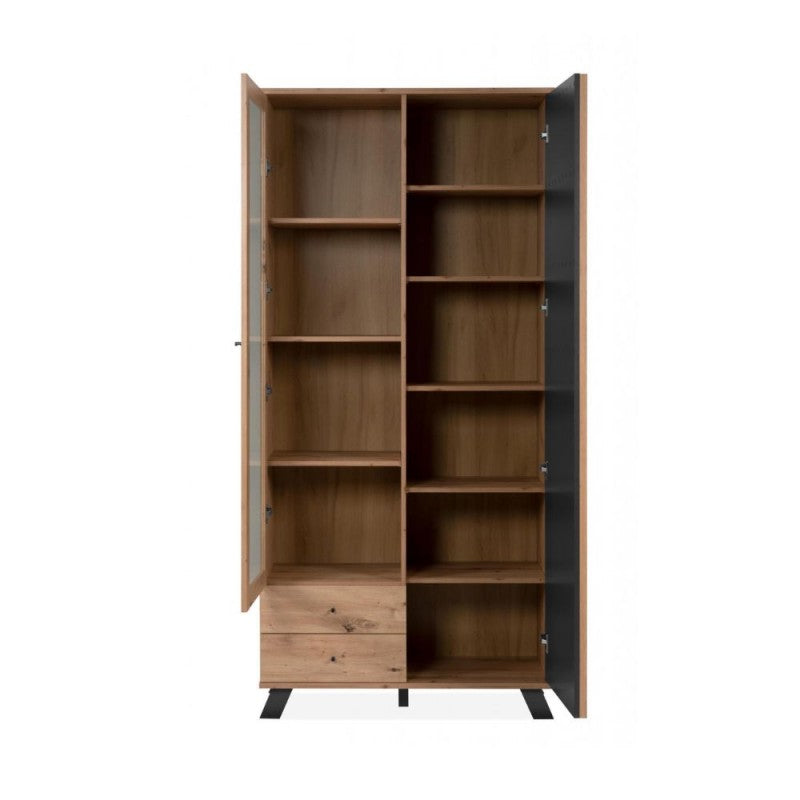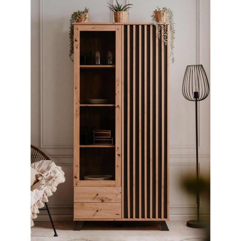 Vetrina 2 ante 1 anta in vetro 2 cassetti e 8 ripiani, anta con doghe, colore rovere e antracite.