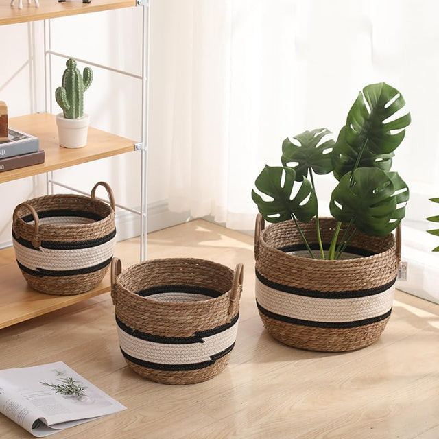 Set 3 Ceste in paglia naturale intrecciata e corda di cotone colore Bianco e Nero