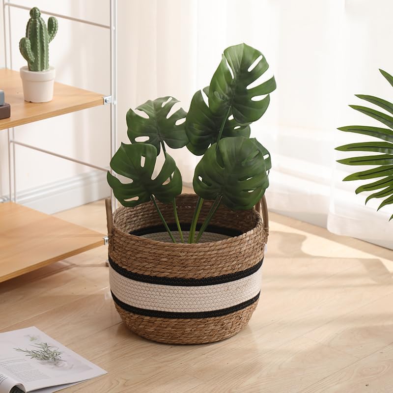 Set 3 Ceste tondi con manici (Large +Medium +Small) realizzati in paglia naturale intrecciata Seagrass(Fibra di Alghe Marine) e corda di cotone nei colori nero e bianco .